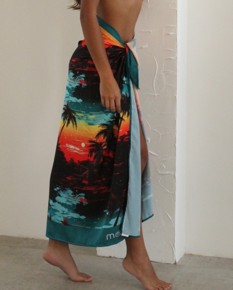 Pareo de seda natural que captura la intensidad de un atardecer tropical. Tonos encendidos y un aire de libertad se funden en esta pieza que refleja el alma vibrante de Mouras.